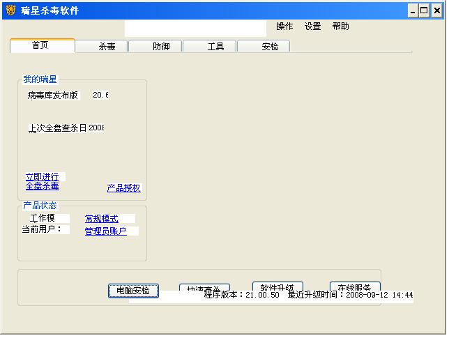 出现问题前的操作步骤:打开瑞星杀毒软件就是这样的.并且我在用2008版本的时候都是好的.