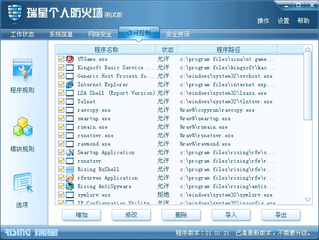 经过瑞星工程师们的努力,目前瑞星防火墙的兼容性已经解决了不少了,在非VISTA系统下,瑞星防火墙已经没有什么问题了。