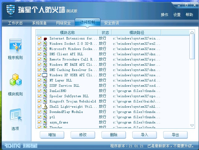 因为瑞星2009防火墙测试版把这个[访问控制]扩展了一下,集成了[模块规则]了。