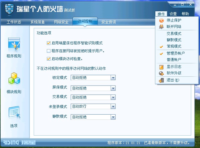 瑞星2009测试版的[操作][设置][帮助]位置移动到了右上角,并且对[操作]这个按钮进行了一些扩充,方便用户切换帐户和防火墙的模式。。