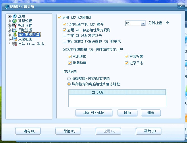 设置为[防御指定计算机],然后再点击增加[网关地址]