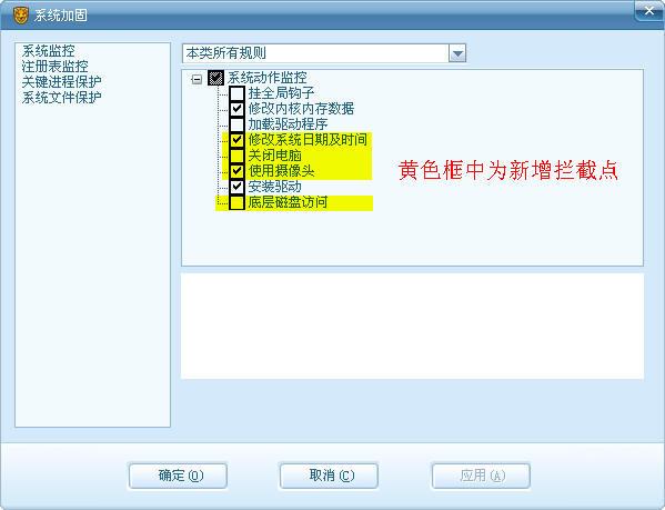 (1) 系统加固:由2008移植而来,打开它的界面仔细和08的对比下发现了一些新增的拦截点。首先,系统动作监控增加了“修改系统日期和时间”,“关闭电脑”,“使用摄像头”,“底层磁盘访问”等新的拦截点。对于那些恶意修改时间导致杀毒软件过期以,清除病毒中恶意关闭电脑的病毒,能强制开启摄像头的后门程序,类似机器狗等的从直接通过底层磁盘访问修改系统文件的病毒有了进一步的防御能力。