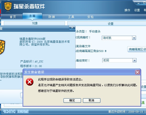 问题现象:右键扫描单个文件时出现提示程序发生致命错误