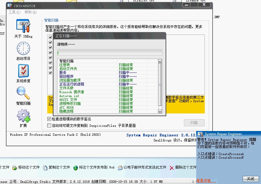 然后我开 遨游 浏览器 浏览器出错 要我发送错误报告,连遨游的安全模式都启动不了. 我换个 腾讯的浏览器 一样要我发送错误报告,点了关闭还是弹出来错误报告, 用 WMPLAY 看影片,提示我系统时间不对,看了下时间居然到了2208还是0228年,   我就顺手改到了2008年.这时我意识到应该是中毒了,然后升级瑞星,居然第一次没反映再点说 升级程序在运行,关了再开升级后重启 开机杀毒,没有杀到病毒,然后进桌面全盘杀毒,还是没有杀到!