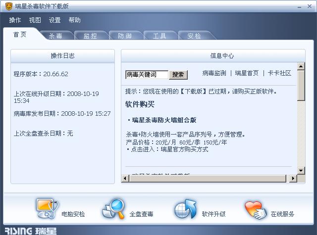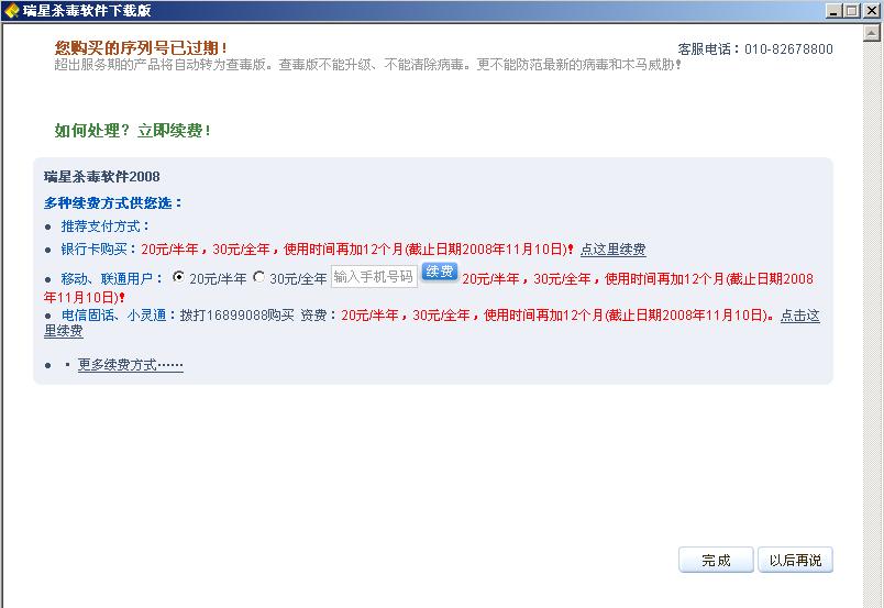 升级照常可以升级,就是不能杀毒了!买的序列号到期是09年10月!不要跟我复制以下原因,因为本人都试过了!期望有高手可以解决一下! 瑞星变成了“查毒版”的解决方法