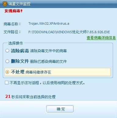 问题现象:优化大师在下载完时用瑞星扫描都没报毒,可是打开其所在文件夹,剪切一首歌时,瑞星监控却对优化大师报毒。真是奇怪。