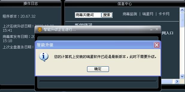 早上都升级到20.67.40版本了,中午15:40升级的时候版本却成了20.67.32了,怎么会这样啊?我到瑞星网站上看的最新版本应该是20.67.41,晕,出现这样的情况,瑞星也太不负责了吧。