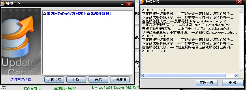 这些图是巡警升级报告.第1张图是关闭防火墙后正常升级,第2张是打开防火墙后不正常的升级,第3张是点开始后还不正常.