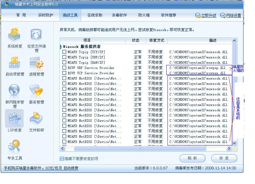 当使用瑞星等杀毒软件杀毒之后,假如出现只能打开QQ但是不能上网的情况可能是病毒或者是木马劫持了LSP(什么是LSP?),当杀毒软件把病毒或者木马清除之后,被劫持的LSP并没有被恢复,所以需要用到瑞星卡卡安全助手高级工具的[LSP修复]功能。