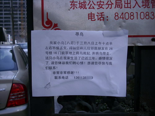 《寻鸟》  拍摄地点:东直门附近。在北京拍了很多寻物启事,本帖的第一张图是寻骡子,这张是寻鸟,北京人爱养鸟,养猫养狗也很多。下面我会陆续贴上寻猫寻狗的。大家可以看看寻物启事里面的北京。电话号码能看全的我都做了模糊处理。