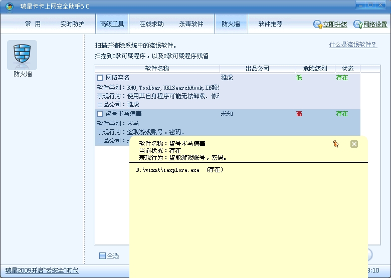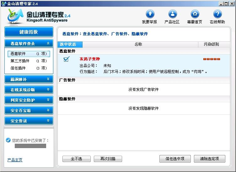 另外一点:云安全现在只是单向的,就是只是从客户端处获得恶意网址信息或恶意行为判断结果,缺少客户端与瑞星服务器数据的实时联系与沟通和互动!真正的“云安全”是从客户端处获得的数据与服务器中的数据进行比对,实时返回处理意见并执行操作!互联网如此海量的信息不可能存储在用户的电脑中(存不下就只能依赖官方的服务器了)。但这样的瞬间数据交换靠现在的网络肯定实现不了!速度上就是一个问题!打个比方:现在的客户端就好比一把屠马的刀,官方的服务器就好比一个人的大脑,客户端把前方的信息实时传到大脑处,至于刀怎么用,完全由服务器发出指令!由服务器发出命令!但现在的客户端基本上仍是单兵作站,至于能否取胜,关键就看杀毒软件给配备了什么武器(现在配的都是病毒库数据),有点单调哟!