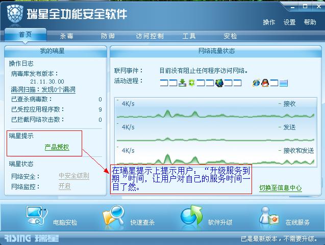 瑞星全功能安全软件没有升级服务到期时间提示,用户根本就不知道自己的瑞星还能享受多长时间的升级服务