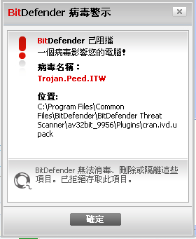 哪位知道?给个招!小弟在这里先谢了!【试了好多杀软,但悲哀的是,居然无法找到。最后还是用bitdefender,但用该杀软也无法查到病毒的源文件位置,只是提示有这么个病毒。】 小弟截了个图,大家看看。