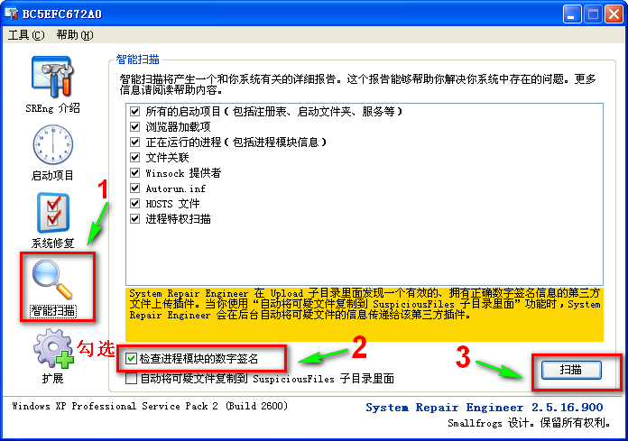 解压后运行 mySREngLdr.com 按下图操作来进行扫描