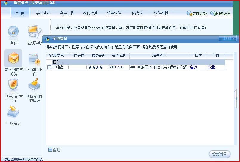 卡卡报我系统有漏洞,我装完补丁后重启后还有,装不上为什么?