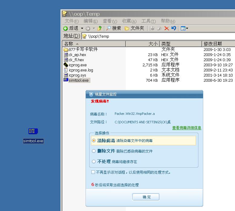 瑞星提示:发现病毒! 病毒名称:Packer.Win32.VmPacker.a ,几秒钟内默认清除病毒,(实际不是清除,而是将文件删除)