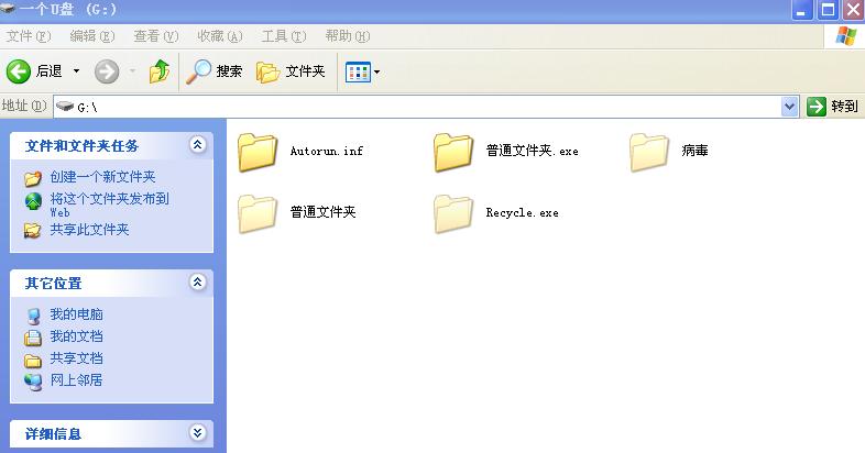 此病毒喜欢把U盘中原有文件夹隐藏,代之以原文件夹同名的.exe格式的文件夹图标,我截了两张图,上传一个病毒压缩.用网上的文件夹病毒专杀没效果.拔了再插上又会出现.