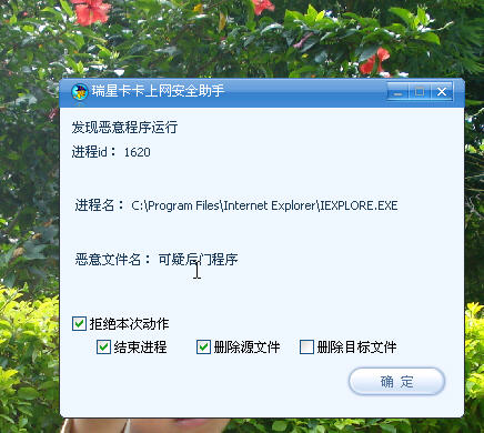 卡卡提示:发现恶意程序运行。代码为:1620 进程名: C:\Program Files\Internet Explorer\IEXPLORE.EXE