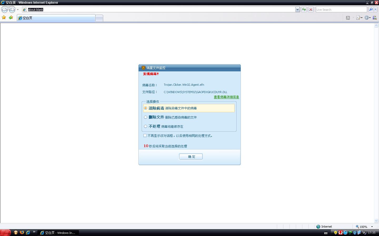 我在想这个问题是不是病毒修改IE和相关的系统文件和设置, 在打开IE的时候就自动去下载这个病毒. 不知道重新下载个IE7的安装程序来安装一下会不会有用, 因为已经安装了IE7, 能否再次安装也没试过.