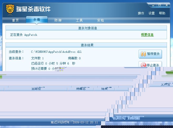 昨晚睡觉之前断了网 设置了杀毒后关机 刚才起床一看 我哭了 竟然还在杀 而且停在了C:\WINDOWS\AppPatch\AcSpecfc.dll这个文件(印象当中好像是这个) 本来想截图的 但是我干什么都慢的要死 打开截图软件 然后瑞星好像就没响应了 我的电脑背景把瑞星挡住嘞。。。 就像图里那样 等了半天还不变回来 我就点关机 可关了估计有10分钟 还在那里关 气的我直接就按了关机