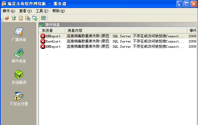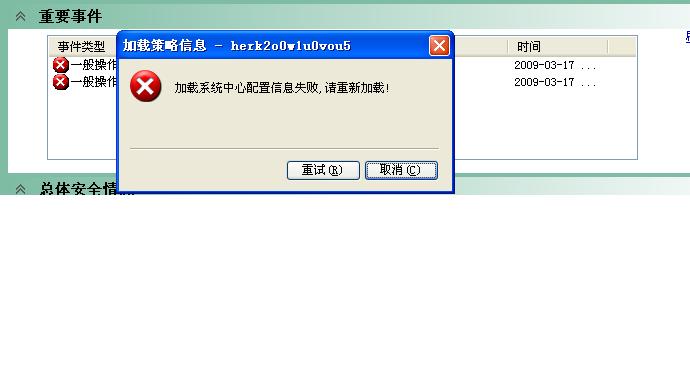 昨天我才将我新买的瑞星网络版杀毒软件装好,并在网站上注册,可不知道怎么的,我打开网络版控制台,点系统中心配置,弹出错误对话框,如图: 打开网络版控制台后的界面,重要事件那块有两个红色的圆叉错误,如图: