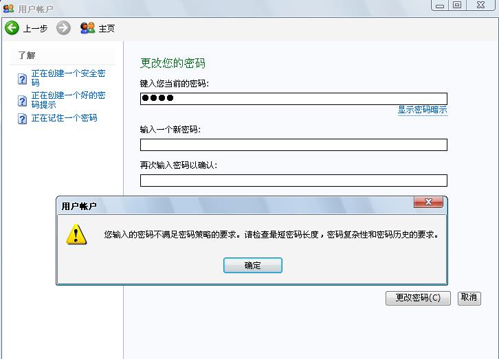 还有,我发现在“用户帐户”里面“更改密码”时,系统会提示,并要求我更改为复杂的密码(如图)。但是我更改为复杂密码后,怎么在欢迎界面里面输入密码,怎么输都不对。