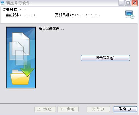 本来用的金山,听朋友说瑞星不错,刚好金山到期了,我就买了瑞星的,结果买了序列号,也下载好了,可是安装不上,总是出现这样的界面“安装备份中”,如图所示,就停滞在这个地方了,希望有高手能指教一下,谢谢。。。