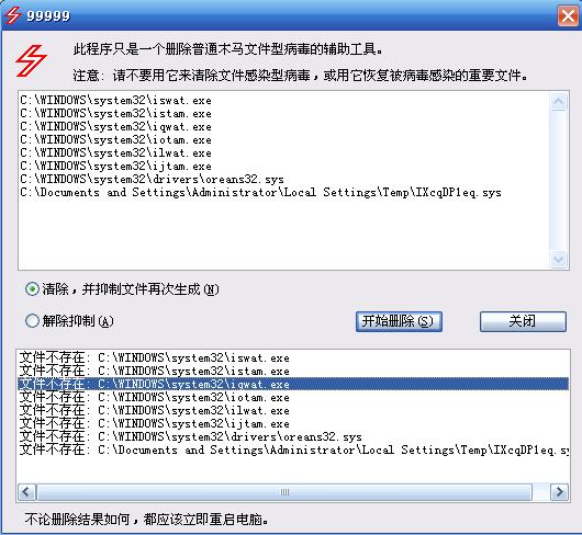 \??\C:\Documents and Settings\Administrator\Local Settings\Temp\IXcqDP1eq.sys这些全部复制进去点击重启删除所有的都会删除还是一次只能删除一个? 那怎么才能看出来我的机子里面没有病毒或者木马呢?再把SRENG日志发过去让你看下?