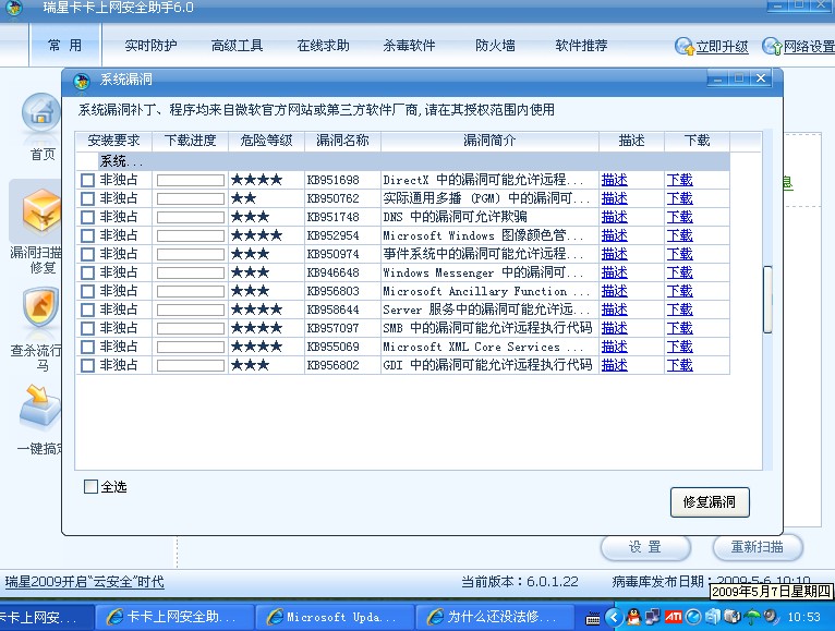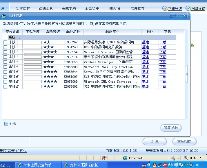 已经是6.0.1.21了.是XPSP3的系统. KB951698 KB950762 KB951748等11个漏洞没法补.