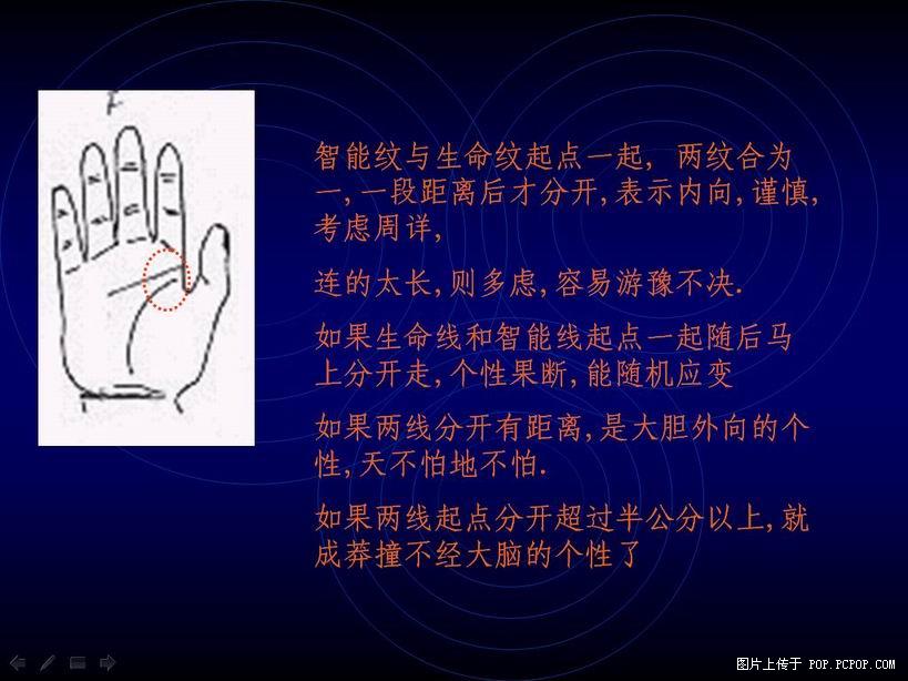 智能纹与生命纹起点一起, 两纹合为一,一段距离后才分开,表示内向,谨慎,考虑周详,连的太长,则多虑,容易游豫不决.