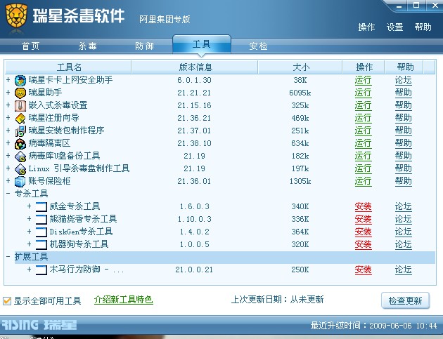 我昨天无意点了瑞星中工具一栏的检查更新,结果装了几个专杀工具和扩展工具,熊猫烧香专杀工具、威金专杀工具、机器狗专杀工具、Diskgen专杀工具和木马行为防御……