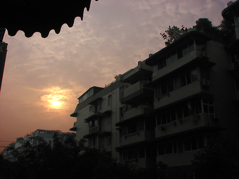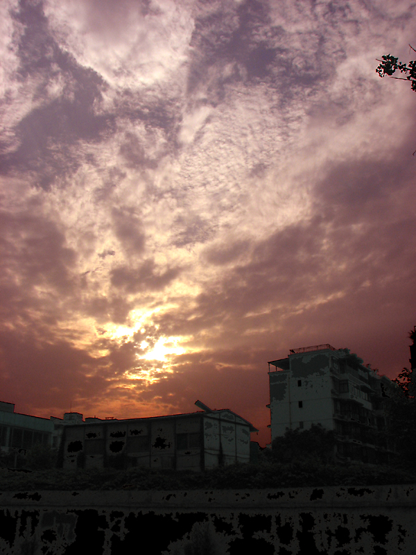 因为拍的天空 所谓显得楼房和树叶都是黑的 不过更显得有些味道~