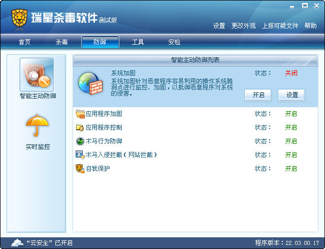 为了专门测试木马行为防御功能,我们关闭瑞星文件监控,系统加固功能,仅开启木马行为防御