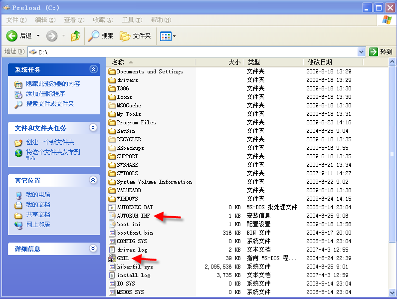 3、连续两次运行此毒,瑞星2010虽然都报毒且处理了,但处理的貌似不到位。第二次运行病毒1.exe后,各分区根目录下的病毒文件autorun.inf及其指向的GRIL.pif已经成功创建。