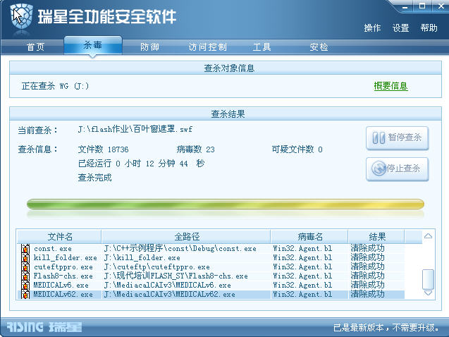 今天用几个杀毒软件做了比较,发现“木马清道夫”跟“超级巡警”这两个软件都很快的搜索完毕U盘,但是没有发现木马。而我最后用瑞星全功能一杀,我KAO,马上出现20几个病毒。
