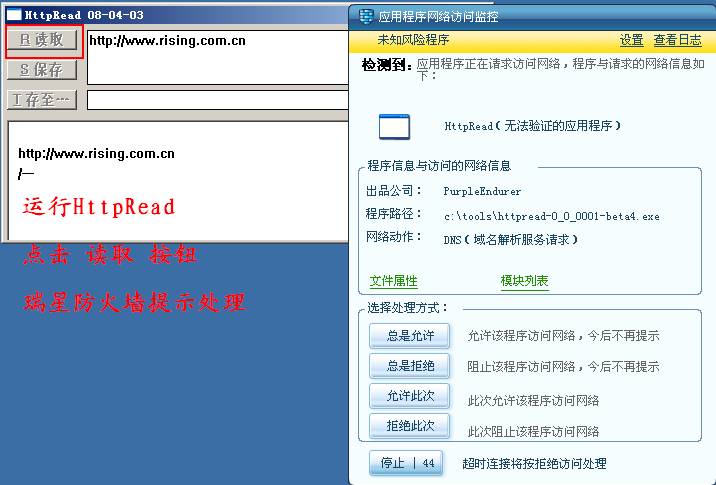 运行HttpRead,点击 读取 按钮,瑞星防火墙提示处理