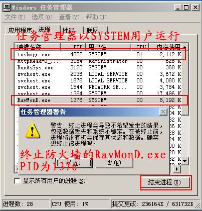 在任务管理器中终止PID为1376的防火墙进程RavMonD.exe