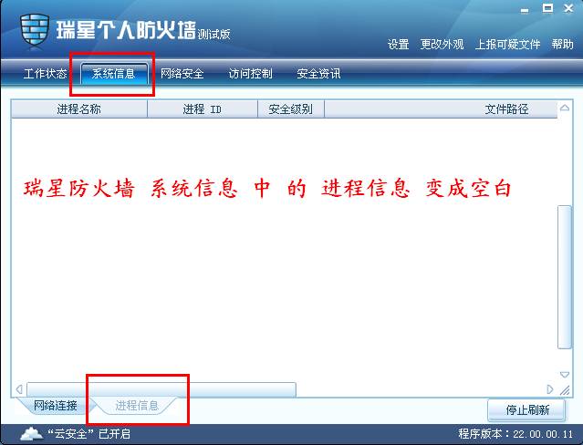 瑞星防火墙-系统信息 中 的 进程信息 变成空白
