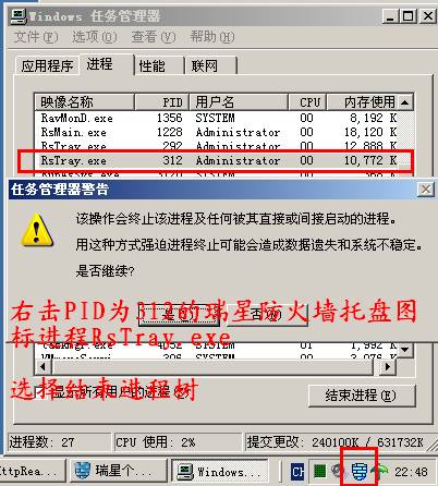 在任务管理器中右击PID为312的瑞星防火墙托盘图标进程RsTray.exe,选择 结束进程树