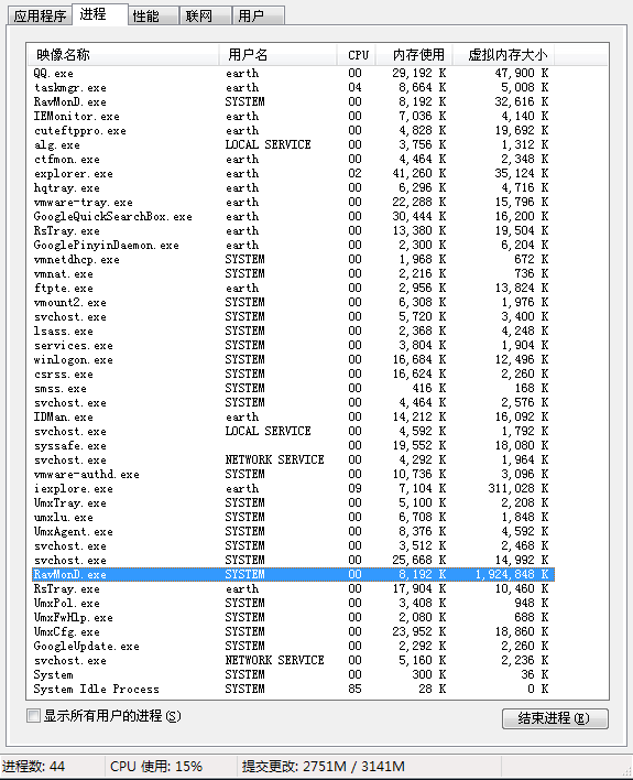 从中午开机到现在没有动软件,刚才打开任务管理,发现瑞星杀毒软件占用虚拟内存都快到达2G。虚拟内存占用也太大了吧!!
