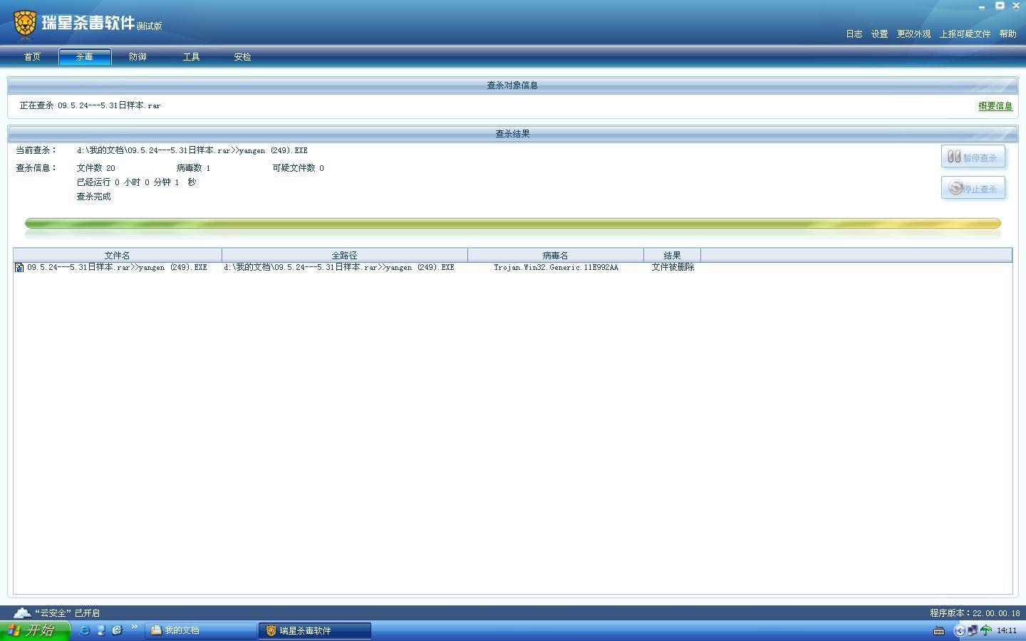 我把杀软升级到22.02.01.03版本后进行查杀,结果上图分析诊断到的病毒文件yangan(194).exe、yangan(236).exe中的病毒Trojan.PSW.Win32.GameO…没有被查杀掉,却意外的把还在分析中的可疑文件yangan(249).exe中的病毒Trojan.Win32.Generic.11E992AA查杀了,查杀结果见下面的截屏: