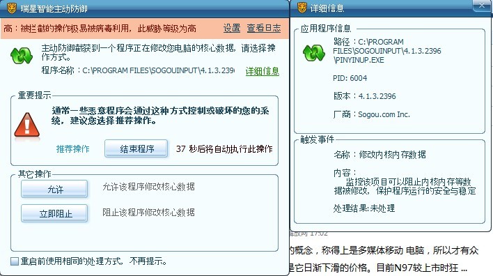 瑞星弹出很多危险动作阻止,我看了很多系统进程,一直观察使用时系统CPU,内存变化,都是不大,而且我的内存使用很不正常,启动电脑以后平时一般是800M-1000M间,而今天启动后电脑一直在500M-650M,使用什么程序都很久很久才出来,内存变化也不大。