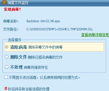 断网杀过了,安全模式里也杀过了,我会的办法都用过了,不行,现在连查都查不出来了,就是几分钟瑞星就自己跳出来说有毒