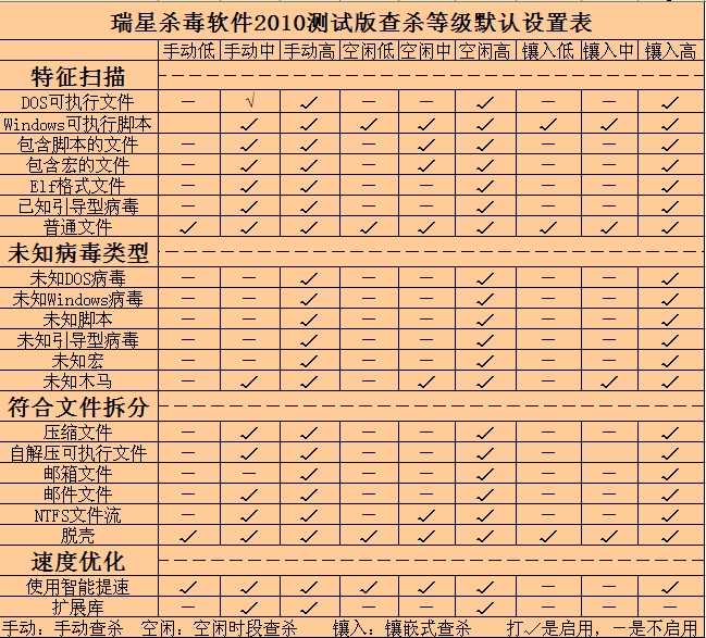 好了,度度来解密下,为什么最低引擎速度快但是扫描文件少,度度曾经在一篇2010的评测文章写过手动查杀的配置,有过一张表,现在度度又把它拿来这!