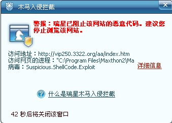 一文,下图为访问含有此漏洞网页时的瑞星拦截截图。