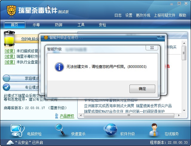 瑞星卡卡安全论坛企业产品讨论区瑞星2010新品体验挑战专区瑞星组合版2010公测 升级提示“无法创建文件,请检查您的用户权限。(80000003)”