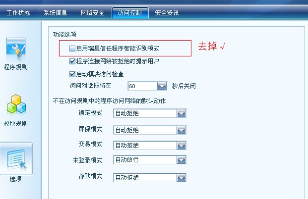 答:建议设置为静默模式,但是但是设置它之后又会有其他问题 :比如不在访问规则中的程序访问网络时会自动拒绝,没有提示