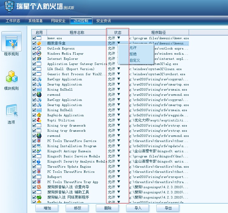 或者,选中要禁止的程序将鼠标移到状态栏,单击左键,修改为拒绝即可