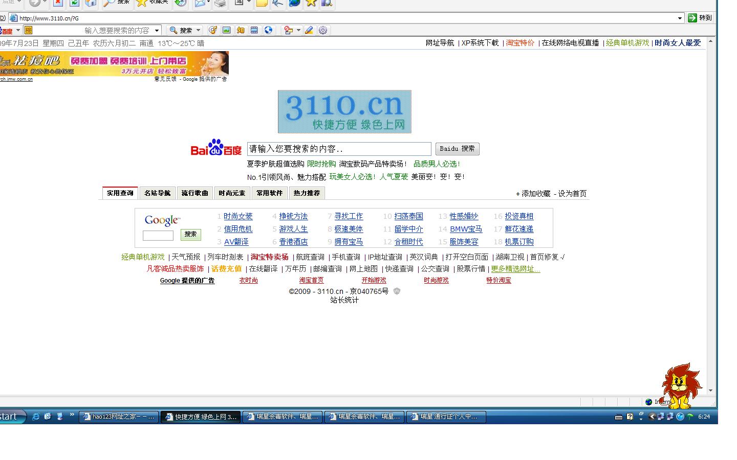 一打开主页就是这个可恶的东东,再查看一下主页设置,并没有被改掉。请教各位高手,如何处理?3110.cn是流氓吗?怎样杀了它?