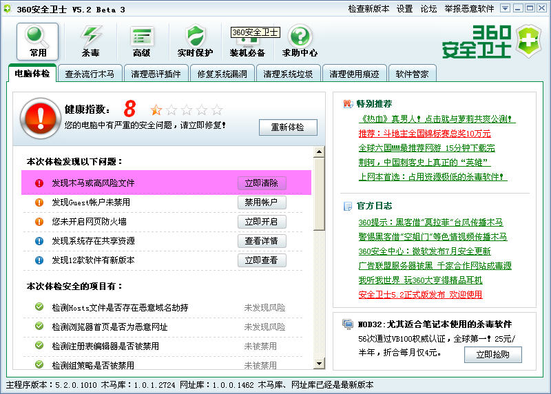今天运行360安全卫士,检测结果把我吓了一跳。如图。